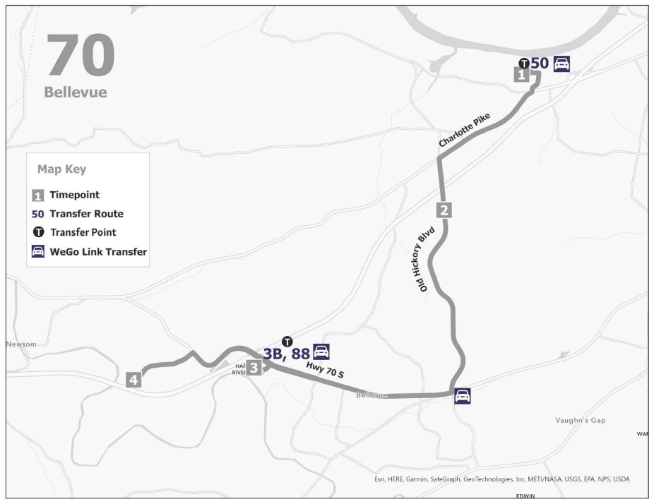 The new Route 70 will connect from Charlotte Pike Walmart, end of line for Route 50, over to the Coley Davis Park and Ride, end of line for Route 3B, then continue to the new James Lawson High School. The route will operate on an hourly frequency from approximately 6 a.m. to 6 p.m. each day.